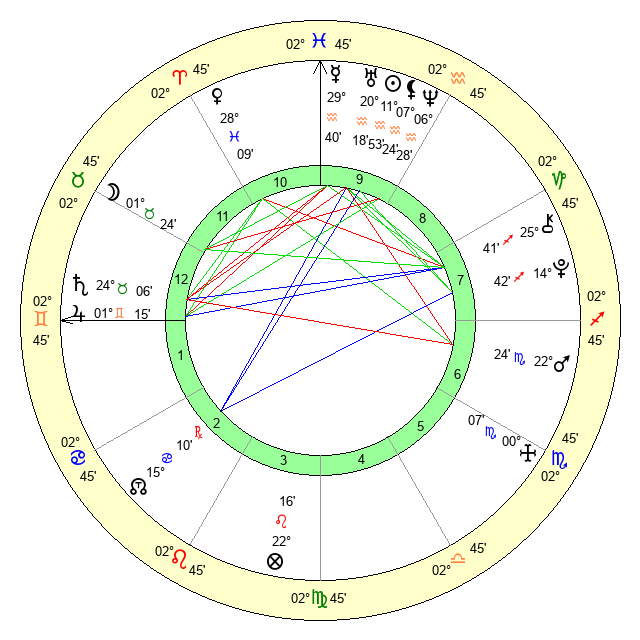 | Moon | 1 Taurus 24 | 10 Pisces 40 | 21 Pisces 14 |