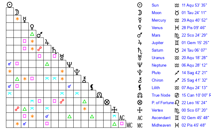 | Sun | 11 Aquarius 54 | 12 Aquarius 4 | 6 Pisces 9 |