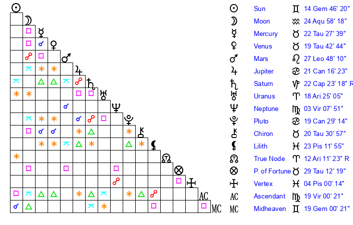 | Sun | 14 Gemini 46 | 16 Gemini 0 | 14 Virgo 49 |