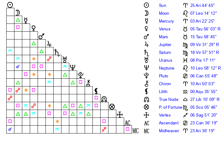 Sun | 25 Aries 44 | 26 Aries 33 | 5 Leo 36 |