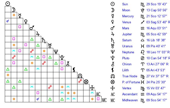 Moon | 15 Aquarius 18 | 28 Capricorn 56 | 27 Scorpio 26 |