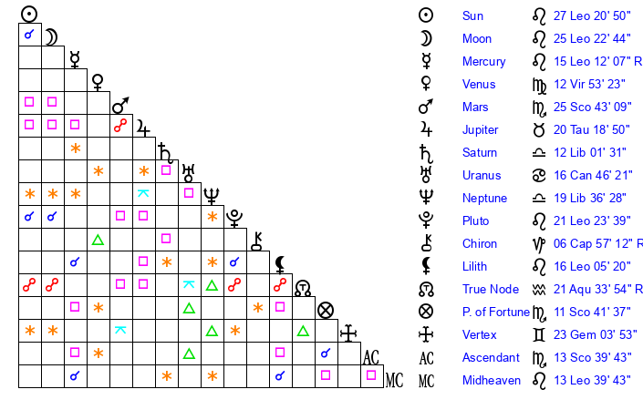Pluto | 21 Leo 24 | 1 Aquarius 59 | 23 Leo 8 |