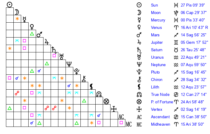 | Neptune | 7 Aquarius 59 | 29 Pisces 31 | 8 Aquarius 31 |