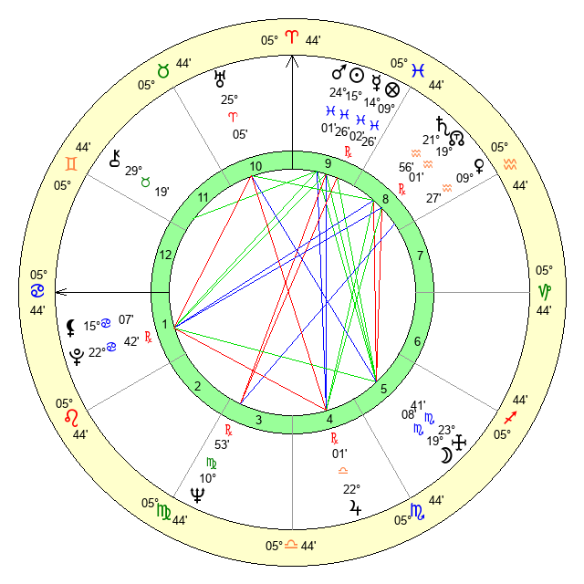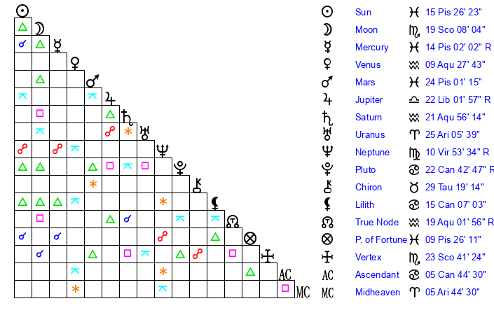 | Moon | 19 Scorpio 8 | 16 Gemini 40 | 29 Pisces 7 |