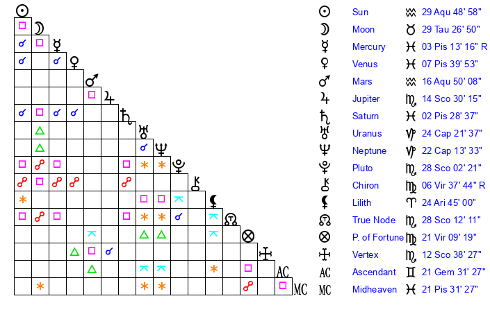 | Sun | 29 Aquarius 48 | 0 Pisces 17 | 0 Aries 51 |