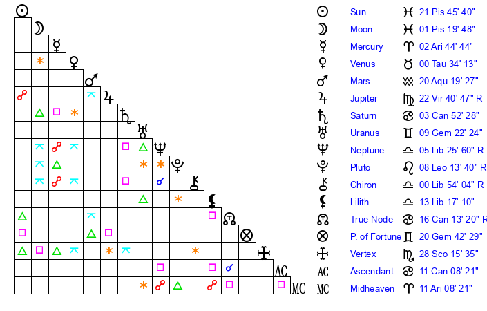 | Neptune | 5 Libra 26 | 29 Pisces 19 | 3 Libra 43 |