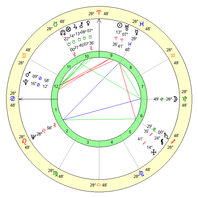 | Moon | 28 Capricorn 36 | 26 Gemini 40 | 12 Leo 10 |