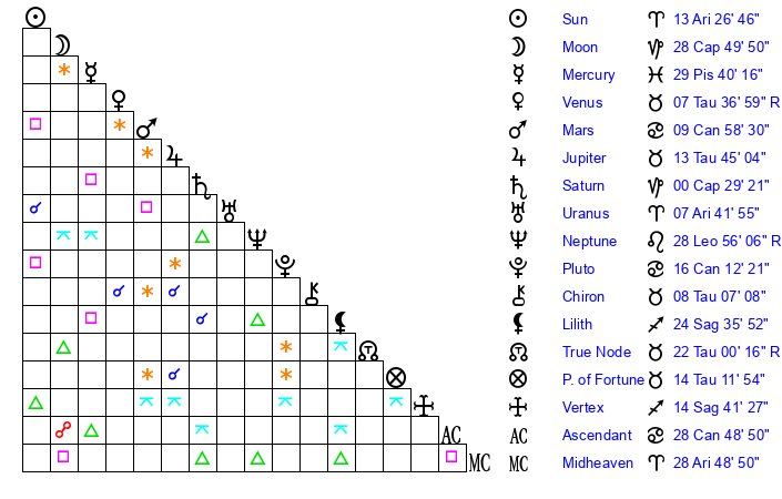 | Moon | 28 Capricorn 36 | 26 Gemini 40 | 12 Leo 10 |
