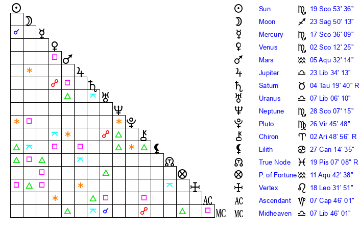 Sun | 19 Scorpio 53 | 20 Scorpio 33 | 15 Capricorn 43 |