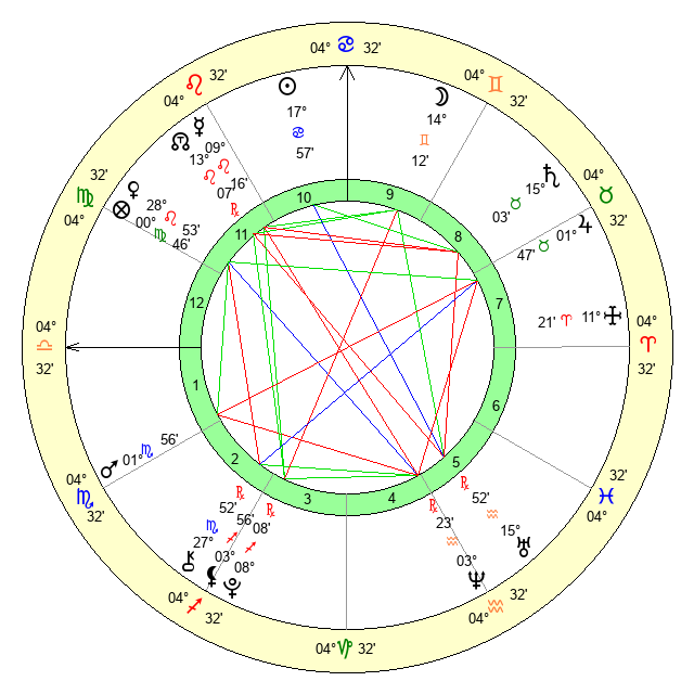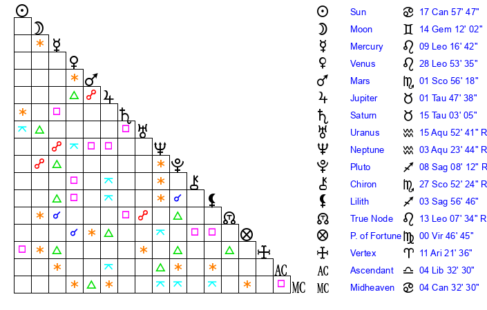 Sun | 17 Cancer 58 | 18 Cancer 39 | 12 Leo 48 |