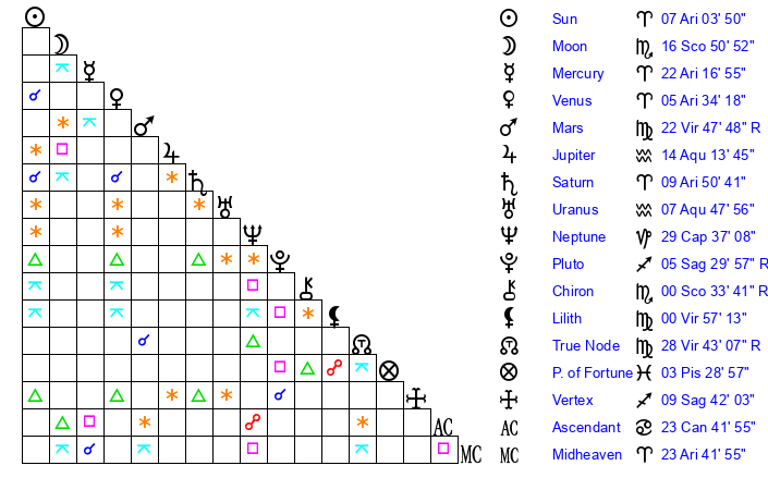 | Moon | 16 Scorpio 52 | 12 Pisces 58 | 26 Scorpio 31 |