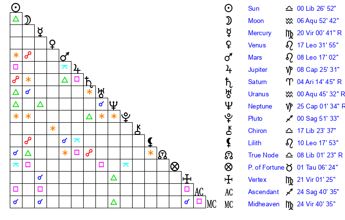 | Moon | 6 Aquarius 53 | 15 Libra 53 | 1 Pisces 34 |