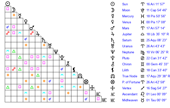 | Sun | 16 Aries 12 | 17 Aries 8 | 13 Cancer 54 |