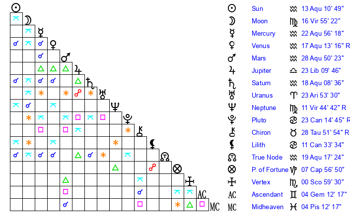 | Saturn | 18 Aquarius 18 | 17 Pisces 32 | 27 Aquarius 20 |