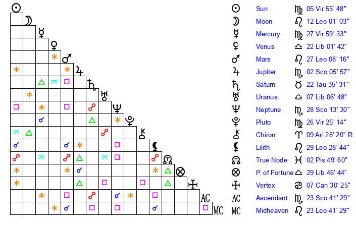 | Moon | 12 Leo 0 | 19 Scorpio 37 | 17 Leo 20 |