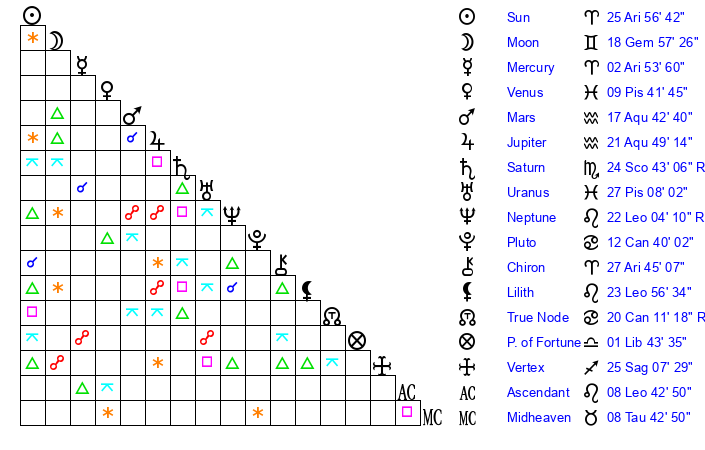 | Sun | 25 Aries 57 | 26 Aries 57 | 1 Leo 1 |