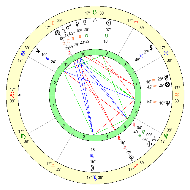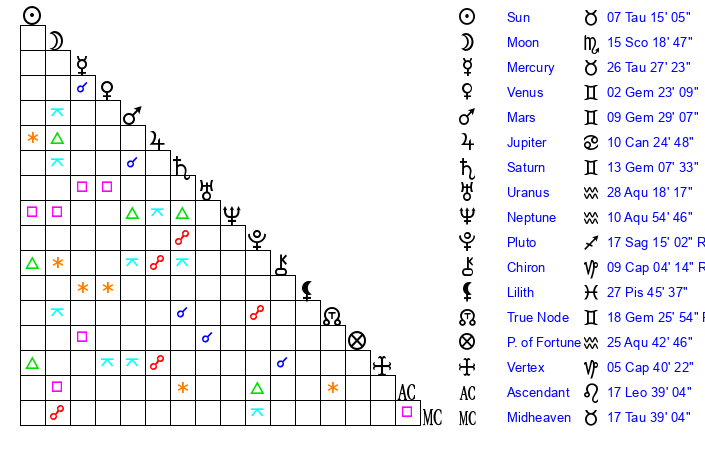 | Moon | 15 Scorpio 19 | 6 Taurus 15 | 11 Virgo 17 |