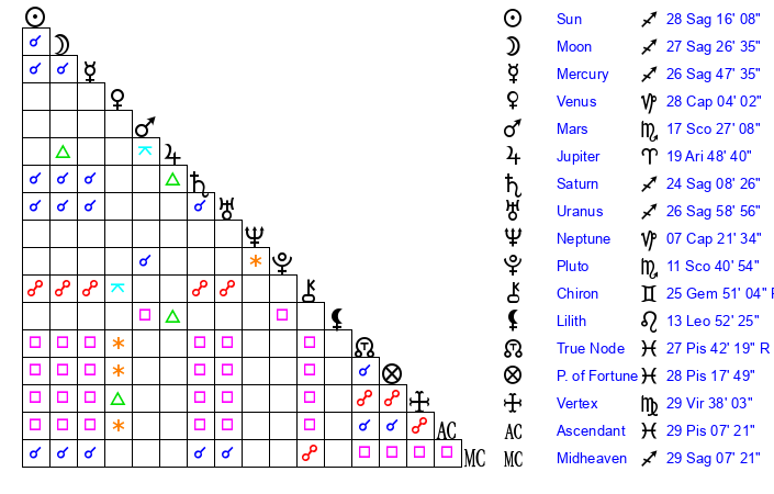 | Sun | 28 Sagittarius 16 | 29 Sagittarius 18 | 5 Aquarius 57 |