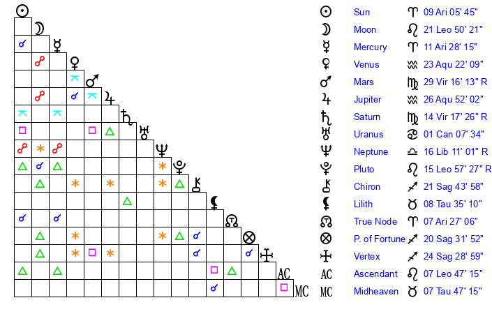 | Sun | 9 Aries 6 | 9 Aries 55 | 21 Gemini 47 |
