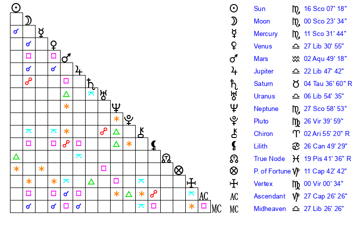 | Sun | 16 Scorpio 7 | 16 Scorpio 32 | 12 Capricorn 55 |