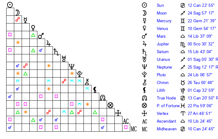 | Moon | 24 Sagittarius 57 | 3 Scorpio 40 | 20 Cancer 20 |