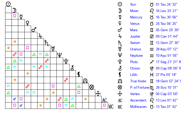 | Venus | 25 Taurus 5 | 26 Pisces 2 | 22 Gemini 59 |