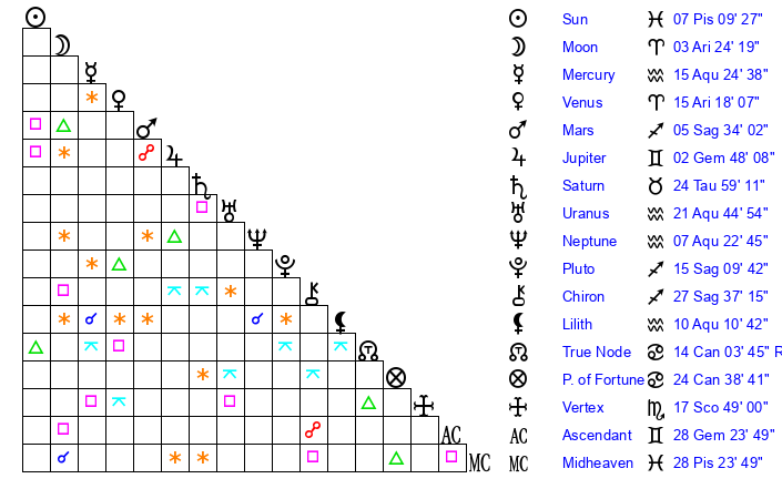 | Moon | 3 Aries 28 | 6 Aquarius 26 | 23 Aquarius 42 |