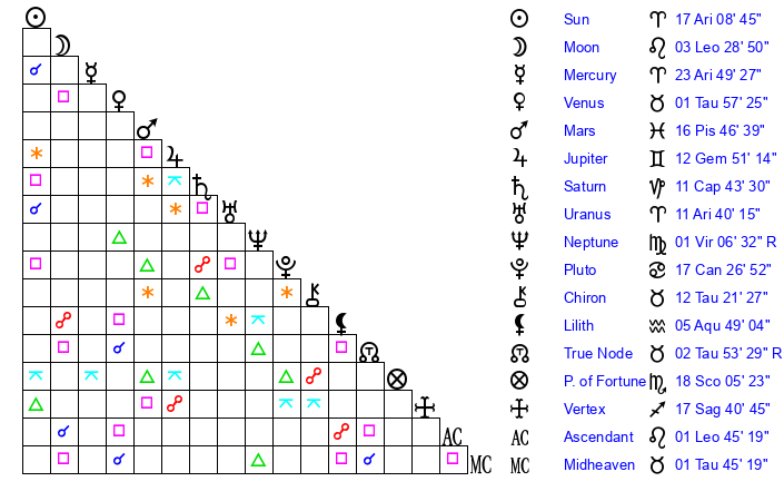 | Venus | 1 Taurus 58 | 25 Pisces 13 | 26 Leo 32 |