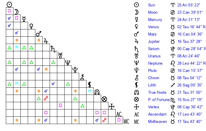 | Mercury | 24 Aries 32 | 0 Aries 6 | 17 Cancer 5 |