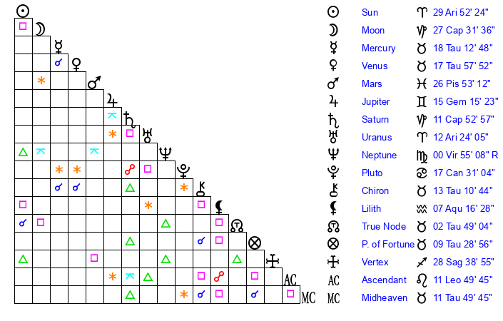| Venus | 17 Taurus 59 | 25 Pisces 45 | 11 Virgo 33 |