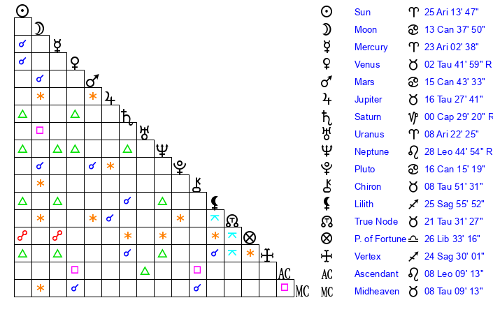 | Sun | 25 Aries 14 | 25 Aries 58 | 27 Cancer 27 |