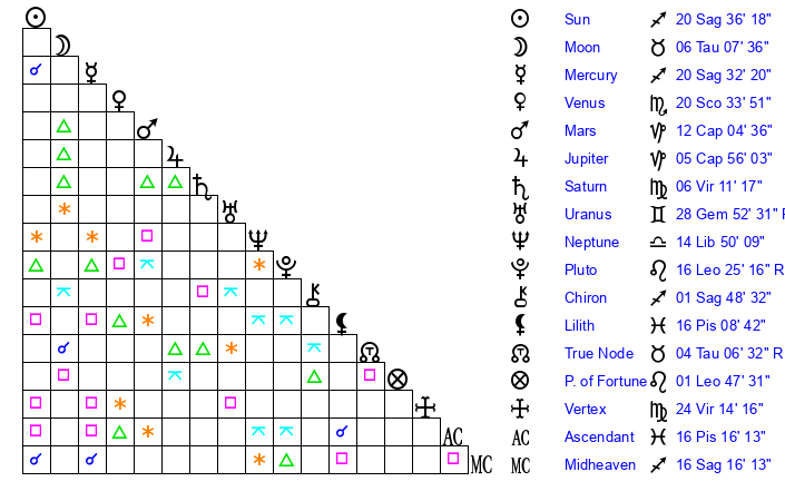 | Sun | 20 Sagittarius 36 | 20 Sagittarius 55 | 8 Pisces 47 |