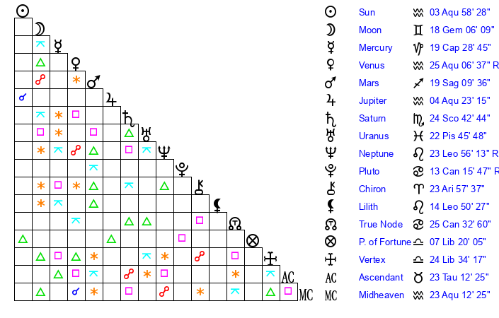 | Moon | 18 Gemini 5 | 6 Sagittarius 16 | 23 Capricorn 53 |