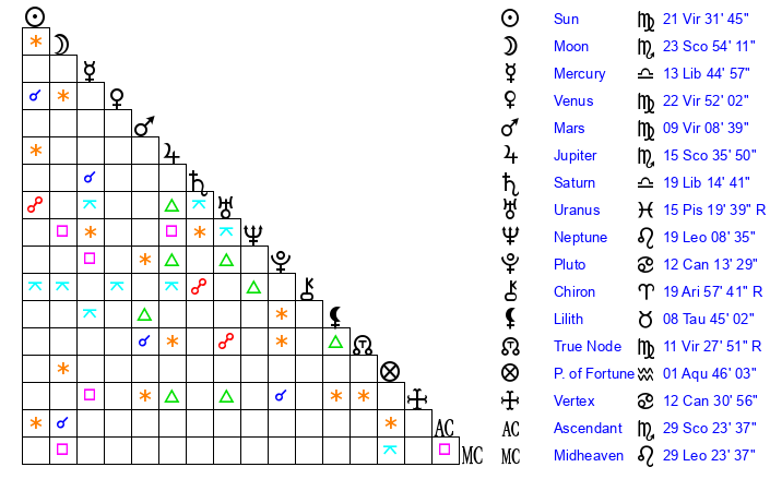 | Venus | 22 Virgo 52 | 24 Leo 59 | 0 Aquarius 6 |