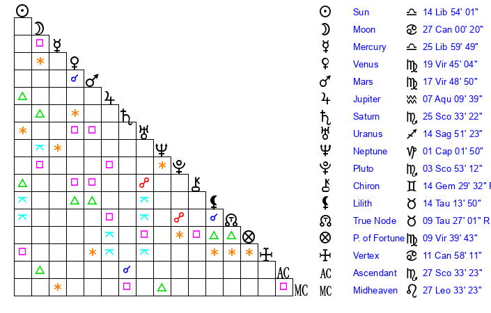 | Mercury | 26 Libra 0 | 2 Scorpio 20 | 14 Sagittarius 51 |