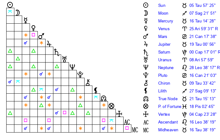 | Sun | 5 Taurus 58 | 6 Taurus 43 | 7 Leo 58 |