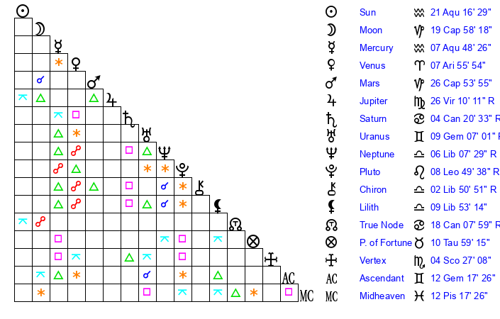 Mercury | 7 Aquarius 49 | 22 Aquarius 33 | 17 Aries 34 |