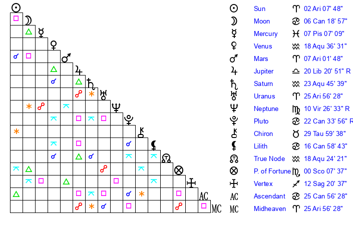 | Mars | 7 Aries 2 | 21 Cancer 3 | 13 Gemini 55 |