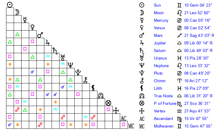 | Neptune | 15 Leo 27 | 29 Pisces 30 | 13 Leo 11 |