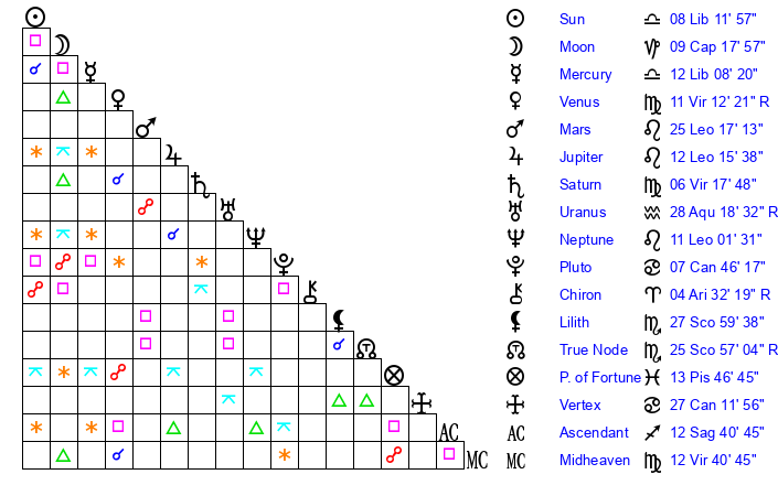 | Saturn | 6 Virgo 56 | 27 Pisces 32 | 11 Virgo 54 |