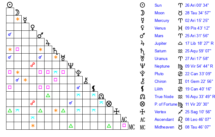 | Uranus | 27 Aries 18 | 25 Taurus 33 | 1 Taurus 16 |
