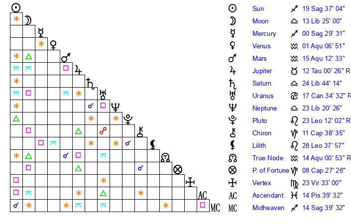| Sun | 19 Sagittarius 37 | 19 Sagittarius 54 | 3 Pisces 47 |