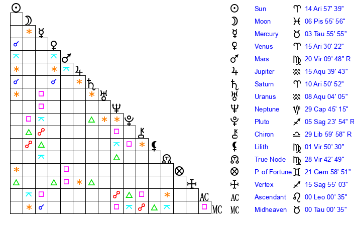 | Sun | 14 Aries 57 | 15 Aries 10 | 12 Taurus 19 |