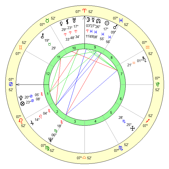 | Mars | 9 Pisces 56 | 17 Cancer 57 | 20 Taurus 52 |