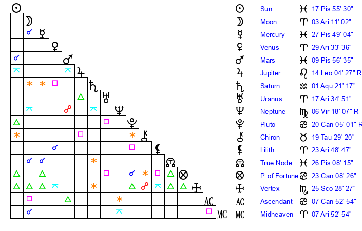 | Moon | 3 Aries 4 | 13 Cancer 43 | 21 Leo 7 |