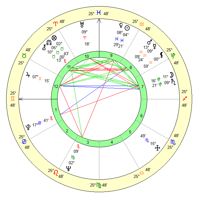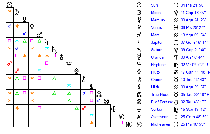 | Sun | 4 Pisces 22 | 5 Pisces 20 | 7 Gemini 35 |