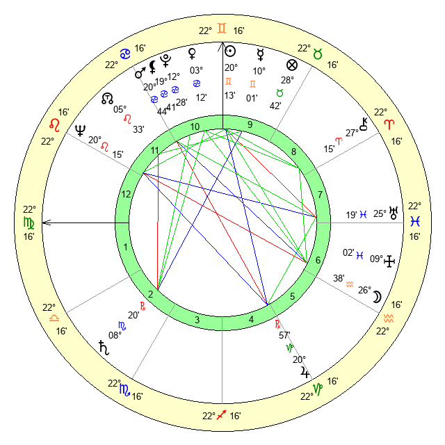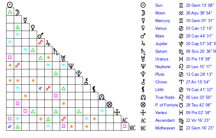 | Sun | 20 Gemini 13 | 21 Gemini 1 | 26 Virgo 13 |