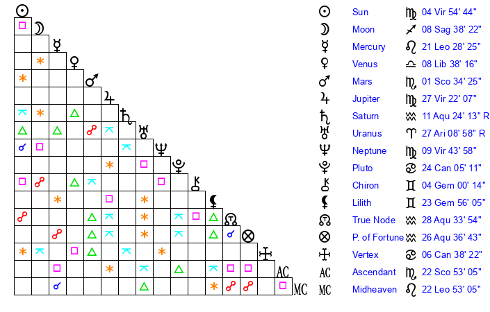 | Neptune | 9 Virgo 44 | 1 Aries 26 | 12 Virgo 18 |