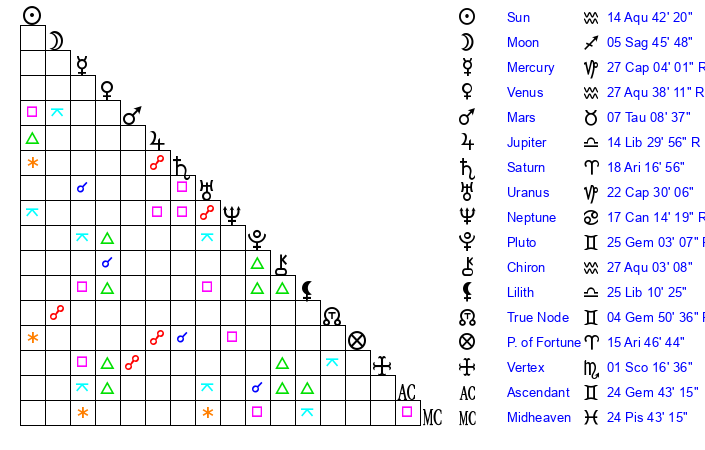 | Sun | 14 Aquarius 43 | 15 Aquarius 49 | 8 Gemini 5 |