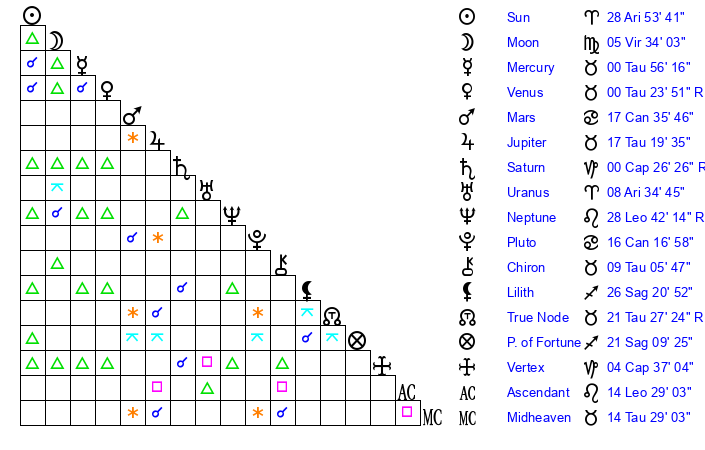 | Sun | 28 Aries 54 | 29 Aries 38 | 1 Leo 2 |